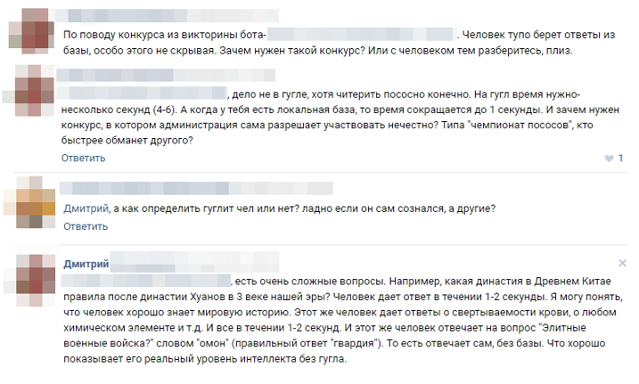 Параллельно такое занижение эффективности бота позволяло немного “очистить совесть”. Получалось так, что бот отвечал мало и в основном в случаях, когда среди зрителей не находилось того, кто бы сам знал правильный ответ. Можно сказать, что бот конкурировал с “гуглерами”, то есть с теми, кто сходу не зная ответа, пытался найти его в интернете, или мог догадаться только после нескольких подсказок.